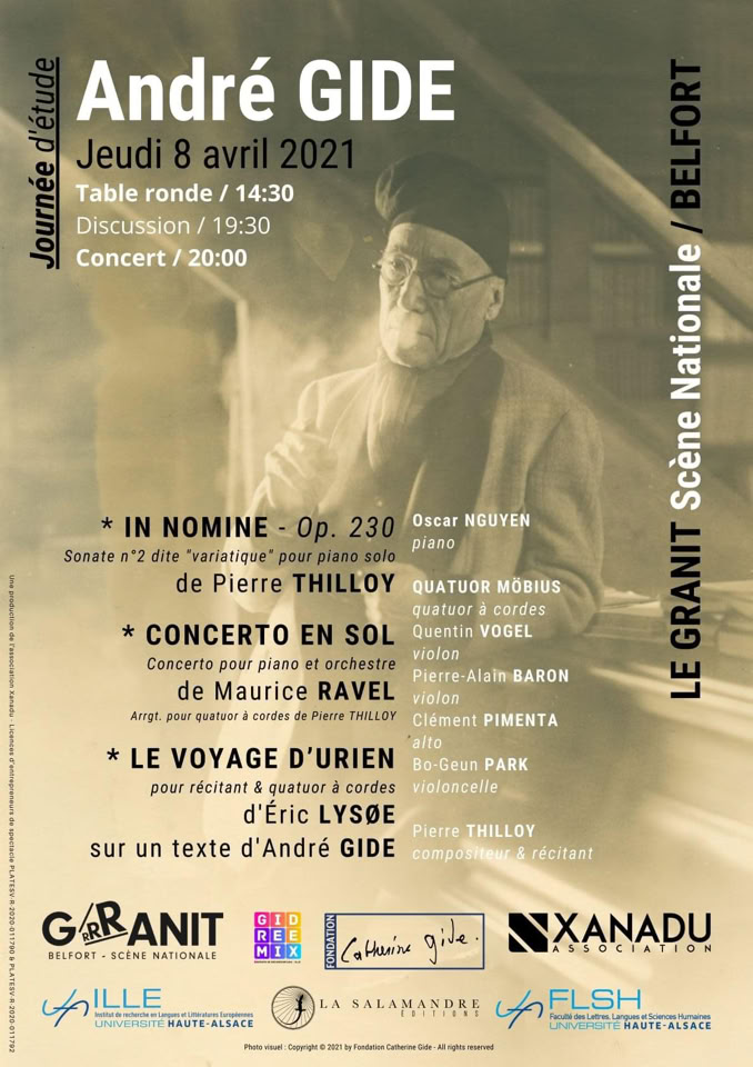 Pour quatuor à cordes et récitant, sur un texte d’André Gide, Belfort, 8 avril 2021, captation vidéo en simultané :